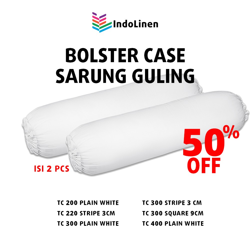 Deskripsi Indolinen - Bolster Case / Sarung GulingSarung guling IndoLinen menutupi bantal Anda dengan mulus dan elegan.Produk ini memiliki beberapa keunggulan, di antaranya: bahan 100% katun import, TC (Thread Count) 300, sangat nyaman dipakai.Ukuran: dia 23x90cm dan dia 23 x100 cmWarna: PutihMotif: plain, stripe 3 cm, square 9cm Material : 100% CottonTC : 200, 220, 300, 400 Harga untuk 2 pcs sarung g